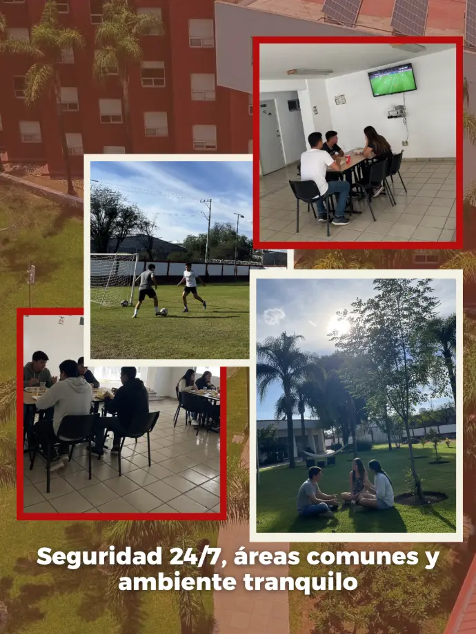Nuestros espacios cuentan con amplio estacionamiento y extensas áreas verdes y de recreación, incluyendo cancha de baloncesto y fútbol. Para la tranquilidad de nuestros inquilinos, proporcionamos seguridad las 24 horas. El lugar ideal para estudiantes y profesionistas que buscan comodidad y conveniencia.